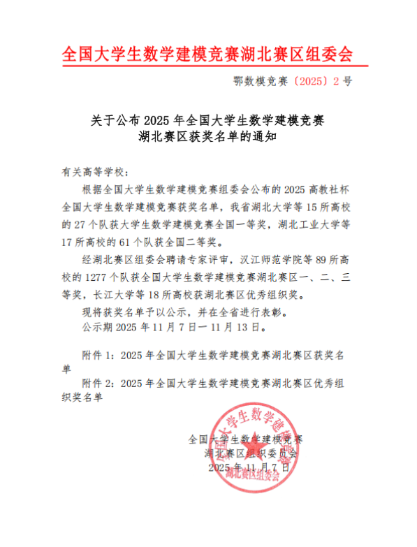 本网消息 2025年11月10日传来喜讯英国365集团在2025年9月7日至9月10日举行的全国大学生数学建模竞赛本科组中共获奖13项,其中湖北省一等奖1项,省二等奖5项,省三等奖7项,获奖率高达38.2%,充分彰显了我校在创新人才培养和实践教学方面的雄厚实力。
